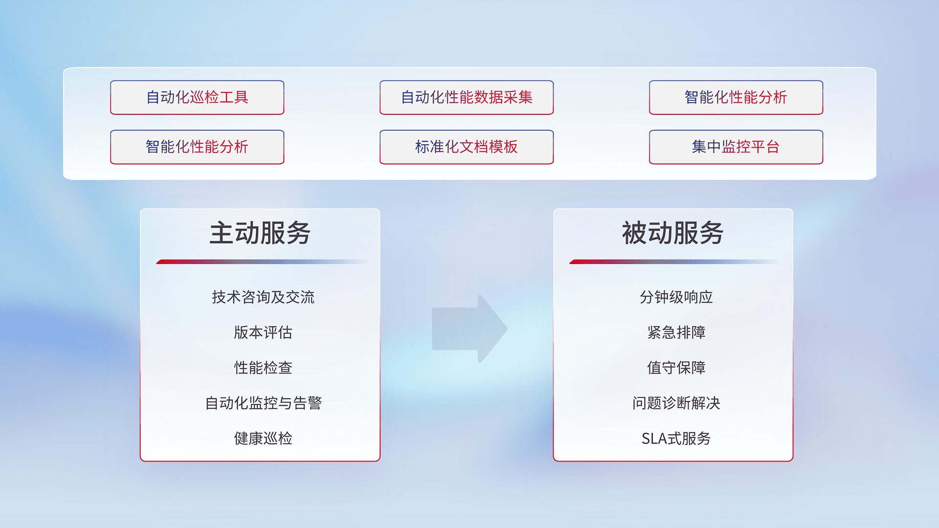 智能化工具和标准化文档,,,,保障服务质量,,,提供主动服务(包含技术咨询、、、、版本评估、、、、性能检查、、、、自动化监控与告警、、健康巡检)和被动服务包含(分钟级响应、、紧急排障、、、值守保障、、、问题诊断解决、、、、SLA服务)。。